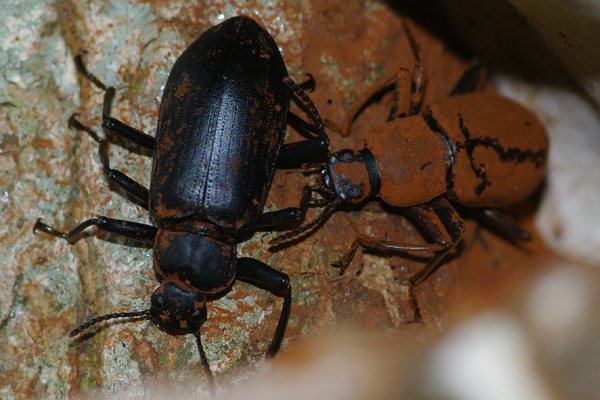 立枯れのカエデの巨木に、巨大なサルノコシカケが生えている。そのサルノコシカケを噛っている虫がいた。ユミアシゴミムシダマシだ。撮っていると、奥から褐色の虫が出てきた。一瞬 別種かと思ったが、見れば サルノコシカケの胞子だらけになった同種だった。