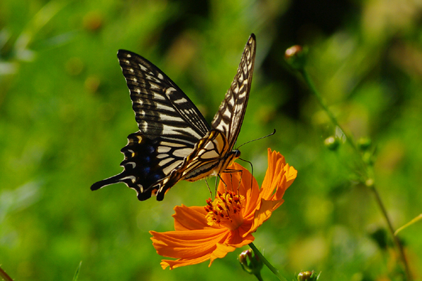 花壇をヒラリヒラリと舞っていたのは、ナミアゲハ。「ナミ」は「並」で、平均的な、普通の種という意味だ。その側では、アカタテハの姿が見られた。アゲハとは対照的に、飛び回ることなく、一つの花から動かなかった。