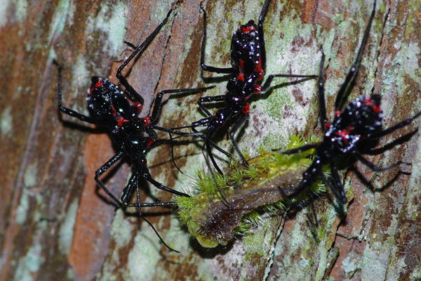 庭のヒバの木の根本に、ヨコヅナサシガメの幼虫が集まっている。見れば イラガ の幼虫を捕まえて、みな一様に細長い口を突き刺している。触れば電気ショックのような激痛となる、イラガの毒毛針も、細長い手足や口を持つ彼等には無効なのだろう。