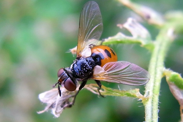 そのお宅の畑を少し歩かせてもらうと、萎れたカラスノエンドウの葉先に、小さなハエがいた。普段ハエはあまり撮らない方だが、今日出会ったハエは、腹が鮮やかな橙色で、楕円形の黒い紋があって とても綺麗だった。マルボシヒラタヤドリバエ というらしい。