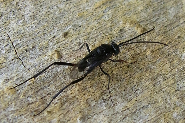 木の幹にいた後脚の長い不思議な形の虫は、ゴキブリヤセバチ という、ゴキブリの卵に寄生するハチだ。初めて見るその姿は実に変わっている。上半身(頭と胸)は一般的なハチのそれだが、腹が極端に小さく、長い後脚がいっそう強調されている。