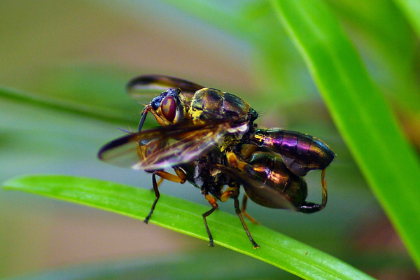 その側のマキの葉に、キラリと光るものが見えた。なんだか複雑な形をした虫だなぁと思いながら近づいてみると、交尾中のハエだった。金紫色の金属光沢がある、とても美しいハエだ。調べてみたが、種名は分からなかった。