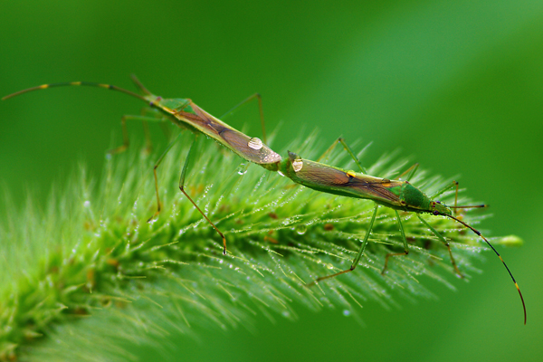 エノコログサには、カメムシの仲間が何種類か集まっているが、その中でも圧倒的に数が多いのが、クモヘリカメムシだ。画像のように、交尾しているものも多い。体中水滴だらけになり、2匹とも背中の同じような位置に大きな水滴をつけているのが可愛い。