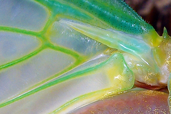 夜9時前頃羽化が始まり、10時頃に翅が伸びきった。色づき始めるのはそれからで、完全に色が濃くなるのは未明頃だろう。これまで何度も載せたセミの羽化。今回は色づく前の翅の付け根部分のアップを載せてみた。なんでこんなに綺麗なんだろうね。