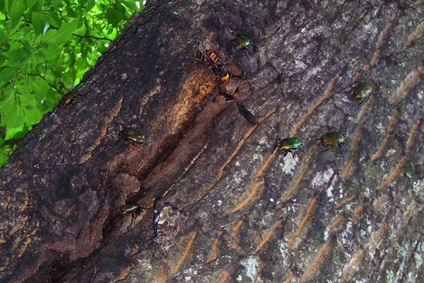 目当ては「昆虫採集」。地元の後輩宅の裏山には、私の知る限りでは県内最高の雑木林がある。そこへは2日目の早朝に訪れることにして、今日は海で泳いだ後、秋吉台のキャンプ地に向かった。キャンプ場はクヌギだらけで、ご覧のように樹液が出ている木もある。否応無しに期待が高まる。