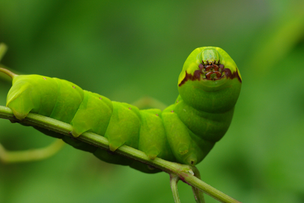 この巨大イモムシはブドウスズメの幼虫だ。よく似た種に、ハネナガブドウスズメというのがいるそうだが、違いがよく分からない。