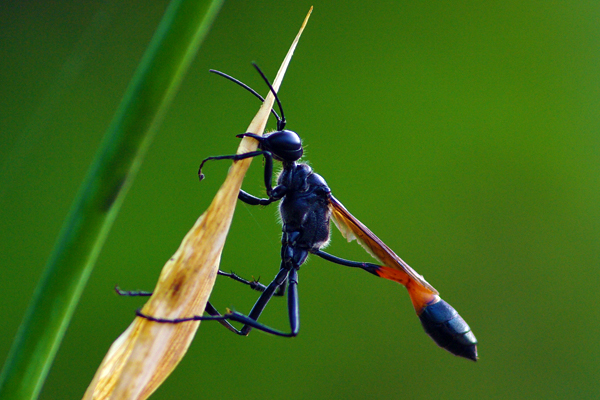 今朝、寝起きの一服をしに庭に出てみると、ユリの枯葉の先で、ジガバチが休んでいた。ジガバチは、ご覧のように大アゴで何かをくわえたまま休む。7年前にも同じような画像を載せたことがある。