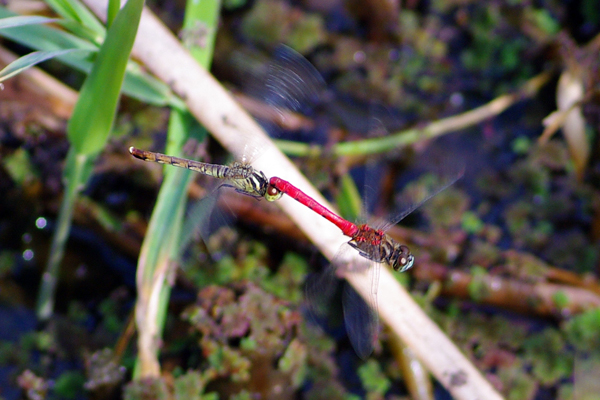 交尾・産卵しているものも多く、写真のように真っ赤になったオスが、お尻の先でメスの頭をつかみ、この体勢のままメスは水面に卵を産んでいる。産卵中は警戒心が薄いのか、少々近づいても産卵行動に没頭しているようだった。