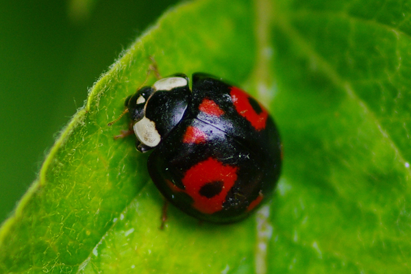 サンザシの近くにあるヒメリンゴの木に、見慣れない模様をしたテントウムシがいた。「新種発見!」ではなく、これは昨日も掲載したナミテントウだ。胸の部分の白黒模様は同じだが、翅の模様が全く違う。私も初めて見る模様だ。昨日の橙色地に多数の黒点模様のものと比べると、とても同一種とは思えない。