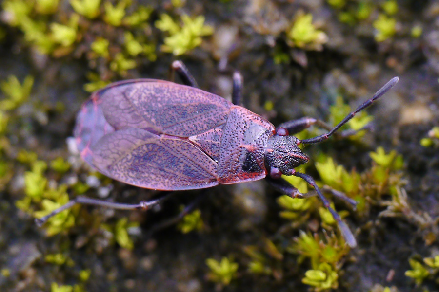 左側が フタモンホシカメムシ の赤色・短翅型、右側が セアカヒラタゴミムシ の黒色型だと思うが、両者ともイマイチ自信がない。