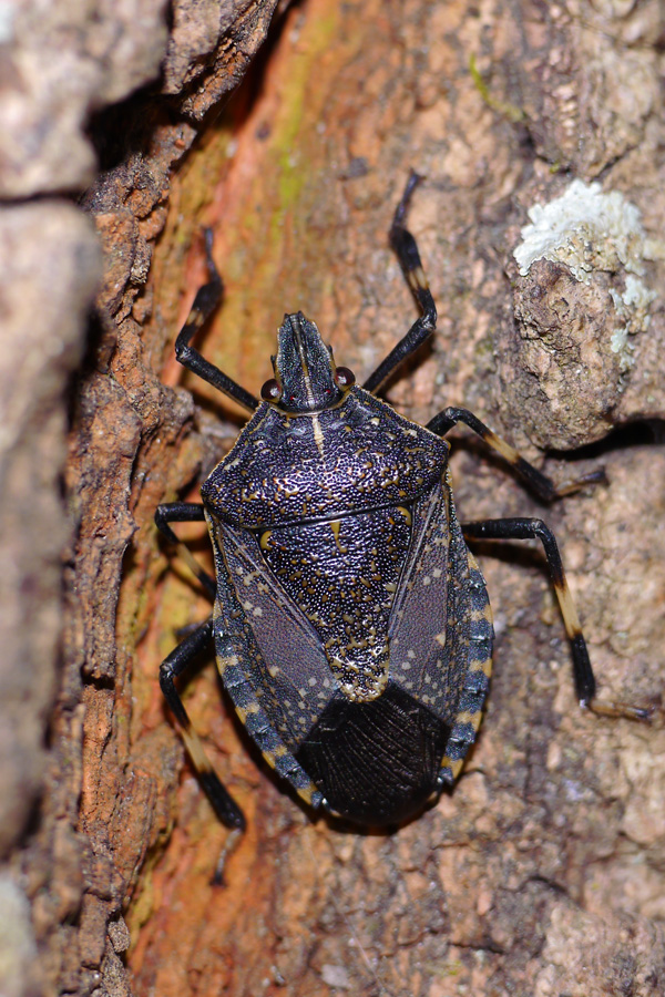 裏の畑のクヌギの幹に、ハチやカメムシの姿があった。左から、クロスズメバチ、ヤニサシガメ(幼虫)、キマダラカメムシ だ。