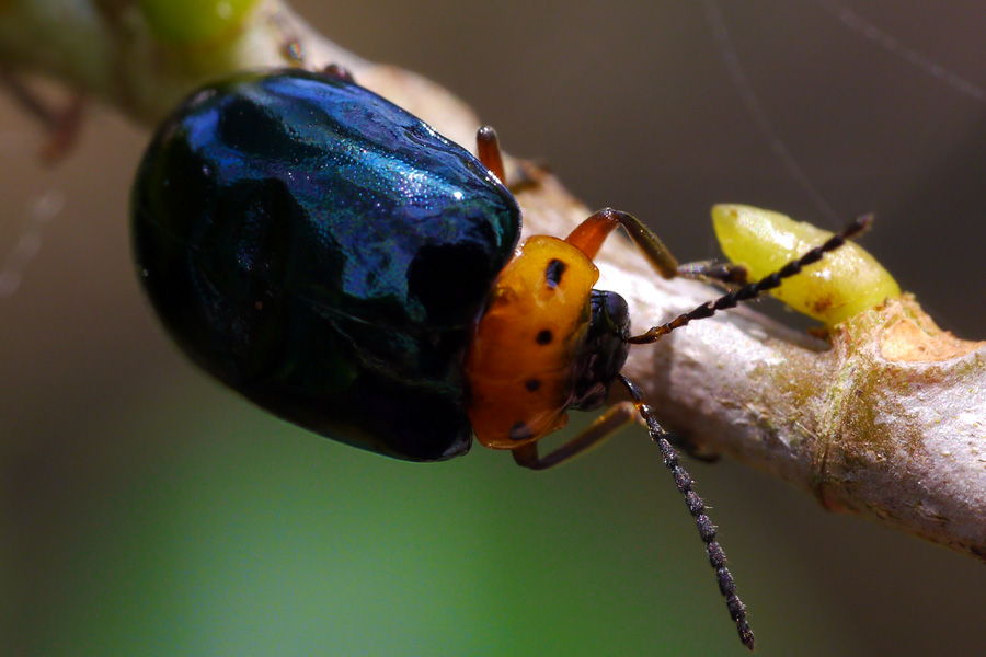 左から、オキナワイチモンジハムシ、タイワンハムシ、ツヤアオカメムシ、そして派手な色彩のヤスデ。