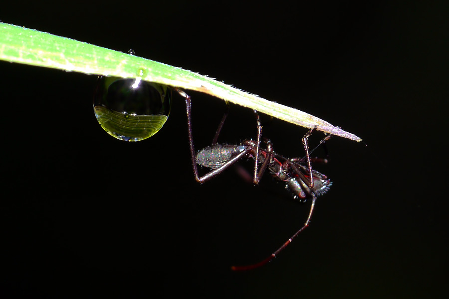 朝の愛犬ハルとの散歩道中、ススキの葉についた朝露の先に、カメムシの幼虫の姿があった。たぶんホソヘリカメムシの幼虫だと思う。薄暗かったのでストロボを発光させての撮影となったが、なかなか美しい絵となった。