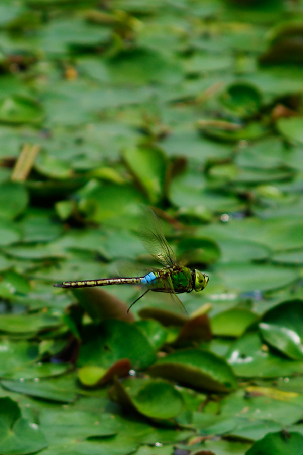 さぁ俄然楽しくなってきた蓮園での虫撮り。湿地だけあってやはりトンボの数が多い。シオカラ、コフキ、コシアキ、ギンヤンマなどが目立っていたが、足下にいたアオモンイトトンボが、素早く飛び立ち、水面をかすめるようにして再び葉上に戻った時には、口に獲物をくわえていた。アメンボを捕ったようだ。