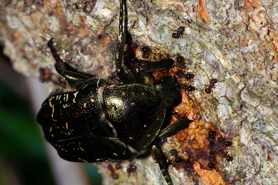 別のクヌギの枝に、見慣れないチョウの姿があった。これはコムラサキだ。5年前に山形県で出会って以来、2回目の出会いだ。決して珍しい種ではないが、自宅周辺で見たのは初めてだ。右の甲虫はシロテンハナムグリ。
