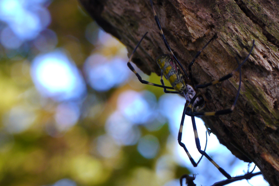 オオゴキブリのいた朽ち木の側に、立ち枯れの木があった。その幹にジョロウグモが張り付いている。極めて普通種のクモだが、背景の木々の隙間の青空の光が綺麗だったので、逆光で撮ってみた。
