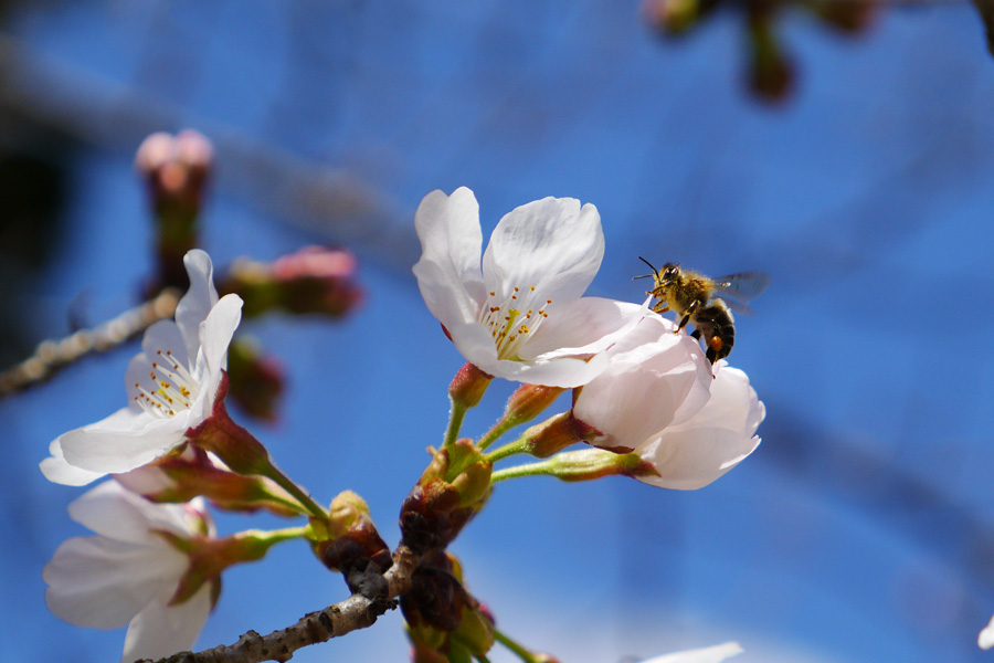 頭上の花にニホンミツバチがやってきたので、カメラを持った両手を挙げてバンザイの格好で撮った。こんな時、可動式モニタは重宝する。
