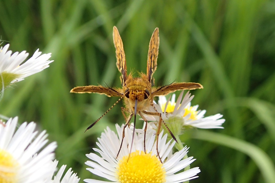 キマダラセセリは独特なとまり方をするチョウで、正面から見ると右の画像のように、前翅を垂直に立て、後翅を水平に広げて、まるでF15戦闘機のような姿だ。。