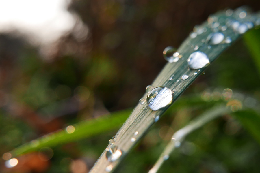 降ったり、照ったり、天候が不安定な日が多い。雨上がりの夕方、なかなか虫に出会えないので、また葉っぱについた水滴を撮ってみた。