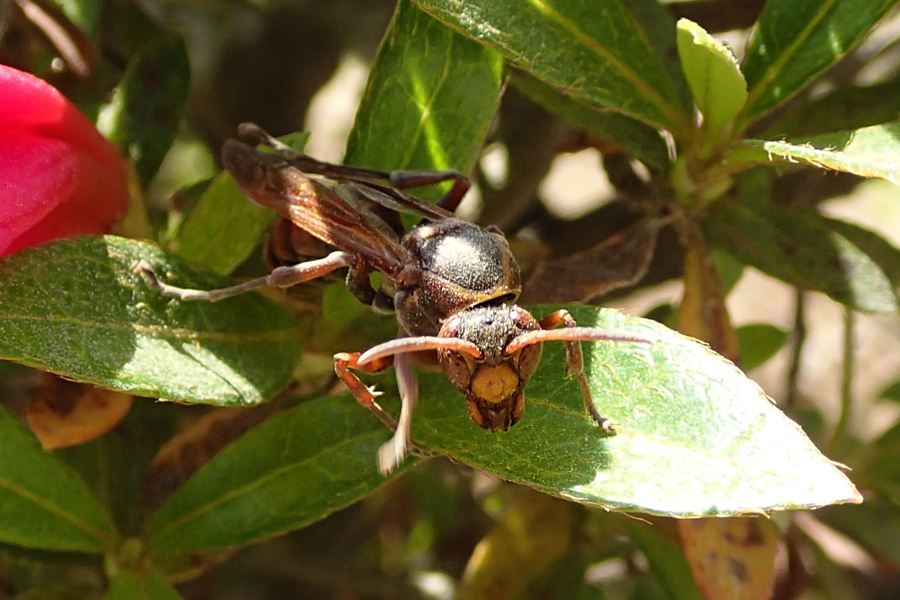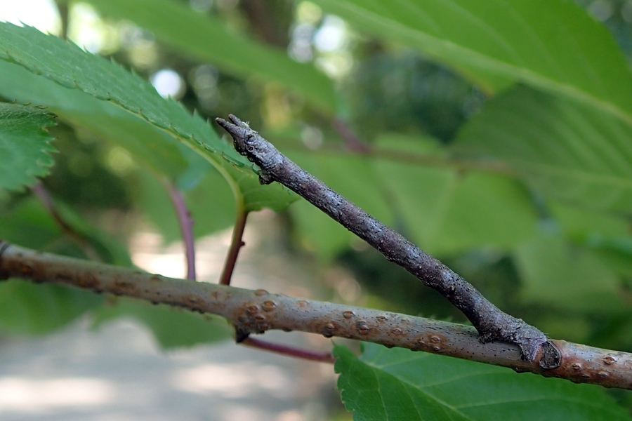 それでも足下のツツジに泥だらけの小さなアシナガバチ、キボシアシナガバチがいたり、桜の枝にトビモンオオエダシャクの幼虫がいた。トビモンオオエダシャク、よく枝に擬態しているなぁ。ちなみに成虫の写真はこちら。