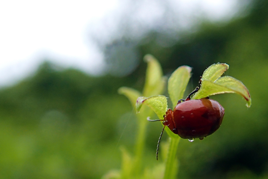 昼前からの雨が降り続く夕方、愛犬ハルの散歩に出かけた。道端のツル草の先に、オオアカマルノミハムシがいた。暗いうえに風があり、しかも左手にハルのリードとウンチ袋と傘を持っての撮影だ。満足のいく写真を撮ることができずに少々残念。