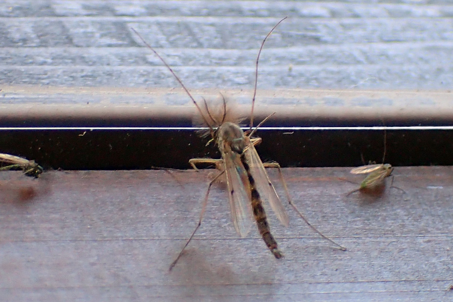 歩き回るとけっこう暑かったので、湖の側のお店でソフトクリームを食べた。窓際にユスリカの仲間がいた。