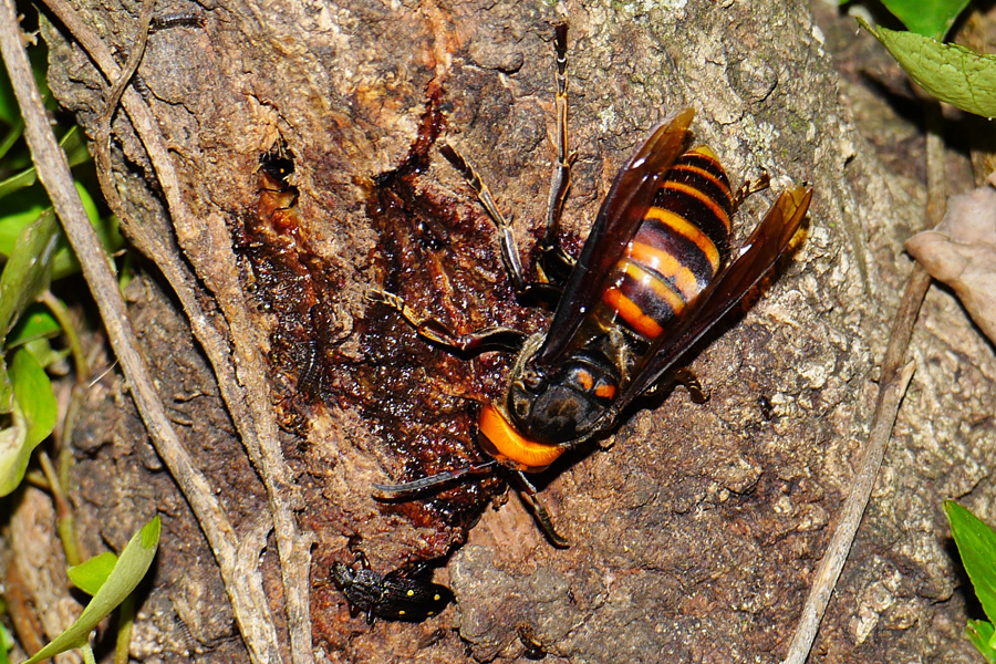 今月13日にコガタスズメバチ、17日にヒメスズメバチがいたクヌギの樹液に、今日はオオスズメバチがいた。3種ともよく似ているが、腹の模様を見比べることで違いが分かる。ちなみにオオスズメバチは腹の黒い縞模様の2本目が細いのが特徴だ。