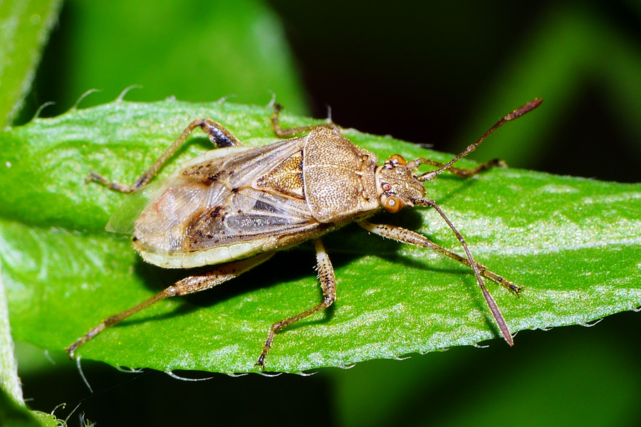 夕方の散策時、足下の草葉にいるカメムシを見つけた。ブチヒゲヘリカメムシ(ブチヒメヘリカメムシともいう)かな? と思ったが、少し違和感を覚えたのでネットで調べてみたところ、コブチヒメヘリカメムシという近似種がいて、どうやらそちらっぽい。頭部の毛の長さを比べると分かり易いそうだが、私には比べようがない。