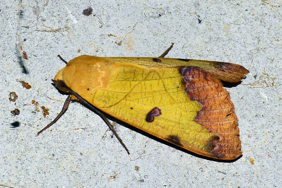 調べてみるとクロモンシタバという、あまり普通に見られることのない蛾だそうだ。鮮やかな黄色に、錆びたような模様がとても美しい。