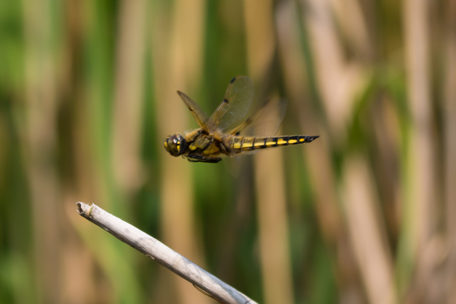 むしろ近似種のヨツボシトンボの方が鼈甲っぽいかもしれない。下の画像がヨツボシトンボだ。トンボは飛び去っても同じ枝先等に戻って来ることが多い。その習性を利用して撮ったのが下の4枚の写真だ。