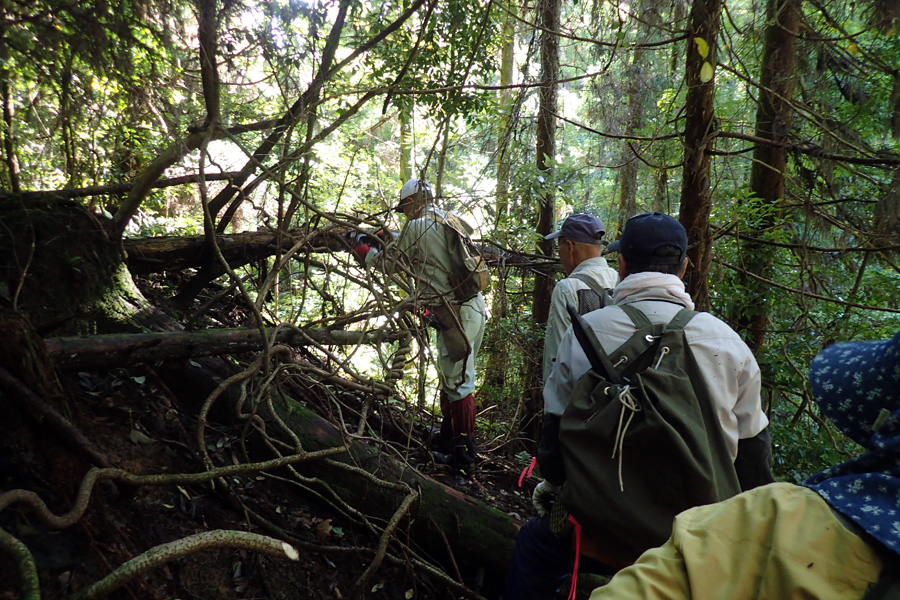 これが中々大変。鉈釜片手に山奥の繁みを進み、急斜面や湿地を歩いてゆかねばならない。午前・午後で約8キロ歩いたわけだが、平地を歩くのとは疲労度が違う。