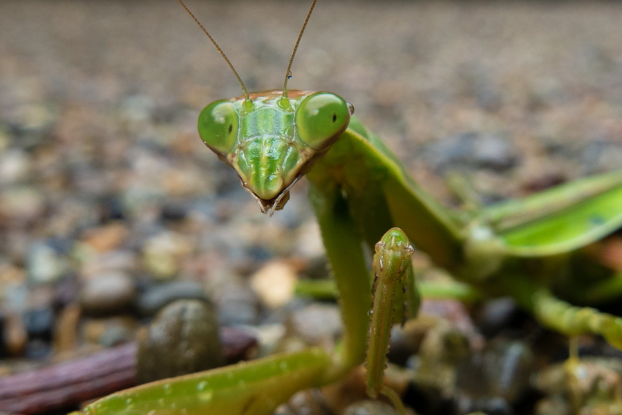 相変わらずの雨模様で、傘を差しての散策となったが、足下の砂利上にはずぶ濡れ状態のオオカマキリのメスがいた。見れば腹の部分が一部潰れている。誰かに踏まれたものだろうか。