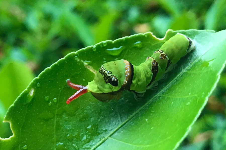 雨降りの途中の長崎自動車道PAで、自販機の側のカラタチか何かの葉っぱにアゲハチョウの幼虫を見つけた。模様の雰囲気から、おそらくクロアゲハだろう。カメラは車の中に置いてきたので、とりあえず手持ちのiPhoneで撮ってみた