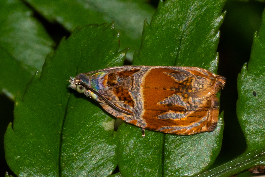 曇り空で歩く遊歩道はとても薄暗く、人も歩いていない。道沿いの葉の上に小さな蛾がいた。クリイロヒメハマキという初見の蛾だ。肉眼ではよく分からなかったが、茶色と銀の複雑な模様が綺麗だ。さらに、頭から胸にかけてはクジャクの羽を思わせる虹色に輝き、神秘的でさえあった。