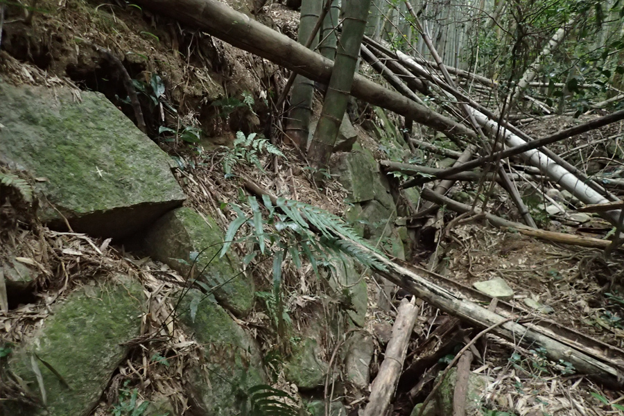 下の画像はその側面。ちゃんと石垣が積んであり、当時は綺麗に整備されていたんだろう。重機もない時代に、先人達は大変な苦労をしてきたんだな・・・。今ではご覧の通り石垣は崩れ、竹で荒れ放題となっている。