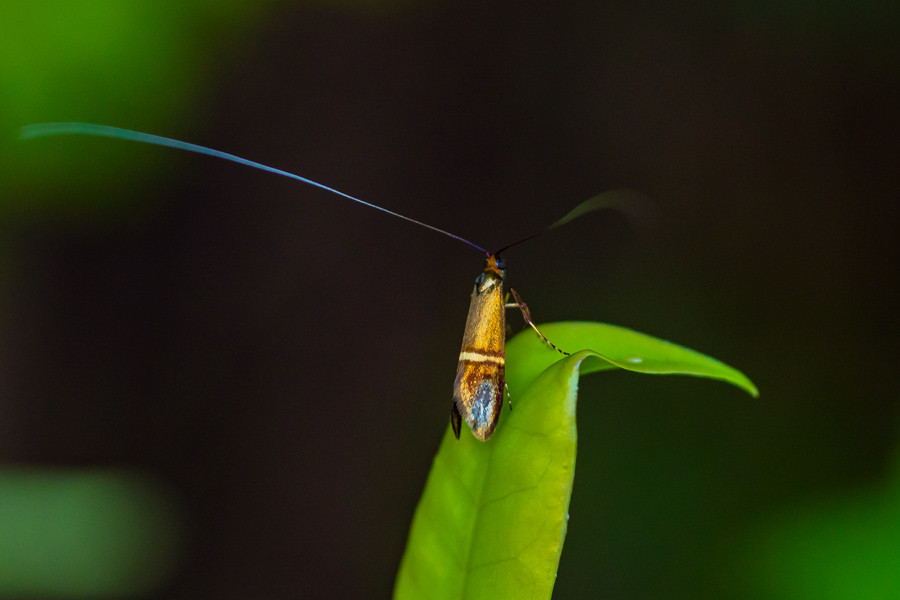 愛犬ハルは狂犬病予防接種をしたので、今日はハル抜きでの夕方散歩となった。道端の若葉の先にホソオビヒゲナガがとまっていた。先月も掲載したばかりだが、その写真では名前の由来である「ひげ長」が分かりにくかったので、今日は長い触角が全部写るように撮ってみた。