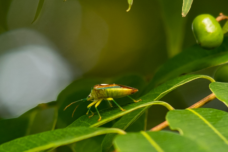 ヒラタクワガタを気にしつつ帰途についた時、頭上のハゼノキの葉にエサキモンキツノカメムシがいた。