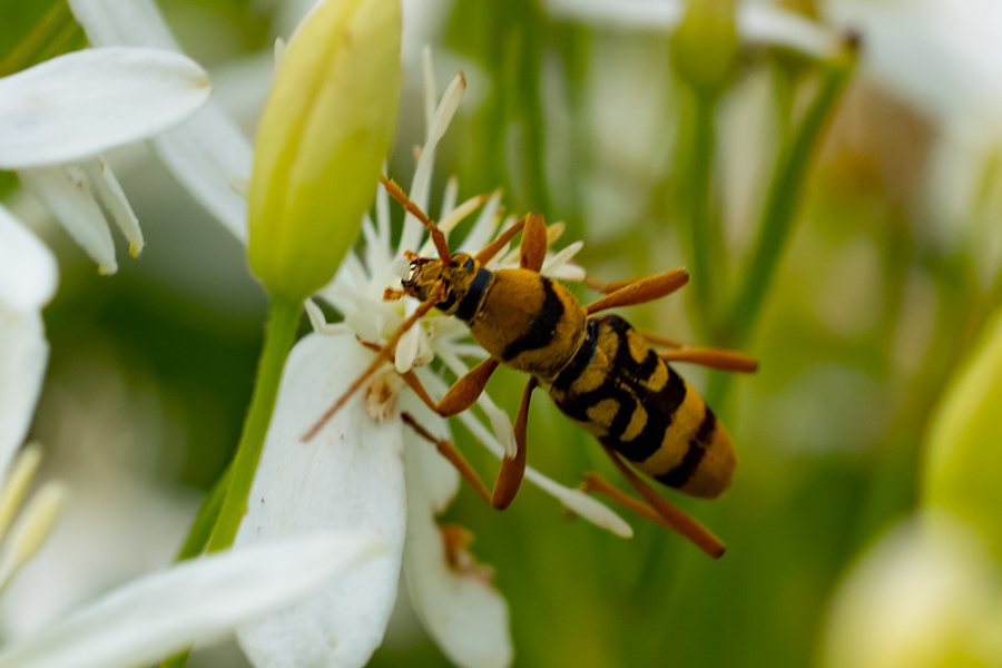 ところで、このヨツスジトラカミキリ、黄色い体に複数の黒いスジがあるが、どう見ても「四つスジ」には見えないんだけどなぁ。