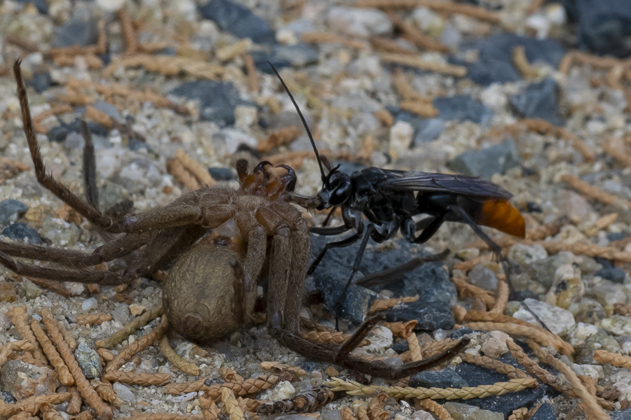 クモバチ(旧称ベッコウバチ)と呼ばれるハチだ。しかし腹の先がこんな風に橙色のものは初めて見る。これはツマアカクモバチという種だ。運ばれているアシダカグモは脚がユラユラと動いている。ハチの毒針で麻酔をかけられた状態だ。このまま巣穴に入れて卵を産み付ける。自分がクモの立場だったらと想像するとゾッとする。