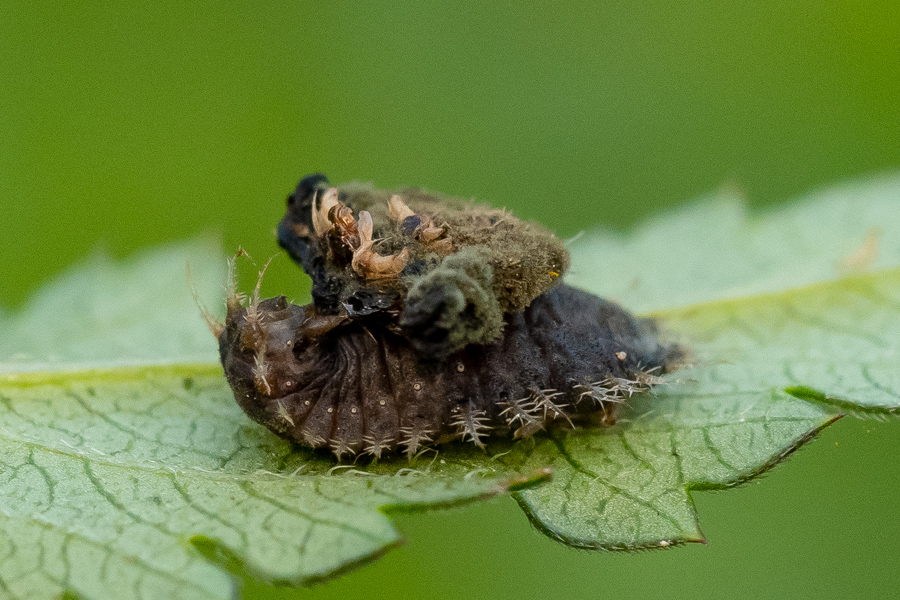 ということは、こいつはヨツモンカメノコハムシの幼虫である可能性が高い。調べてみたところ間違いなかった。