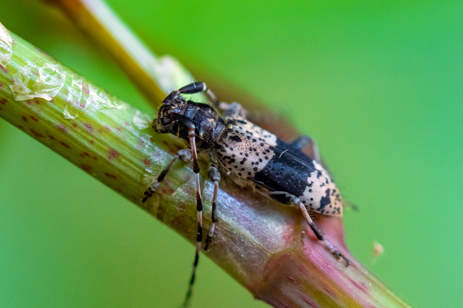 ハムシを撮り終わると、再び妻が、今度はイタドリの茎をかじっているカミキリムシを見つけた。