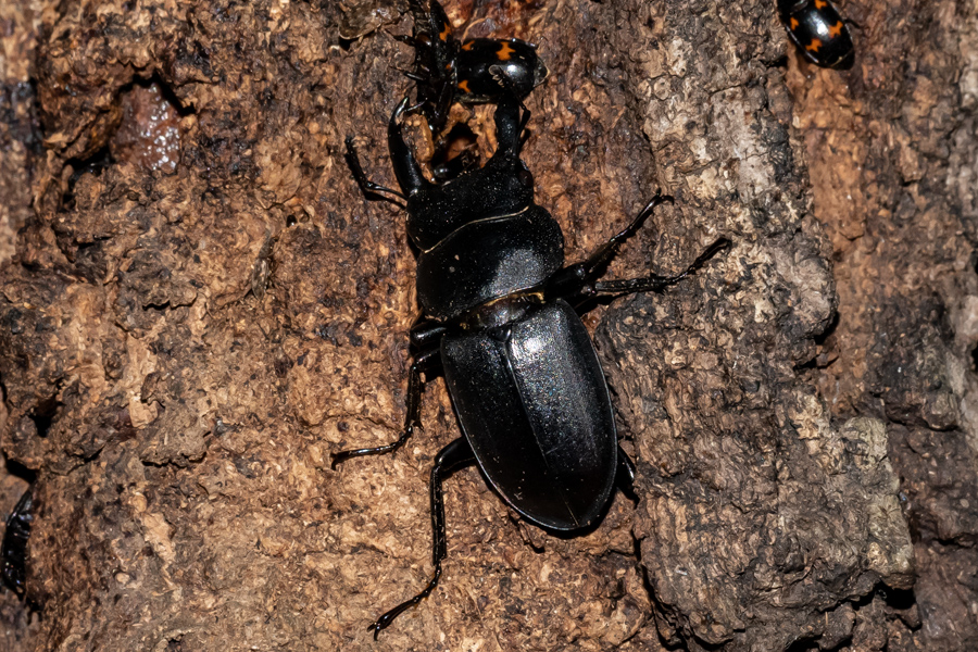 樹液が噴き出しているコナラの木があり、そこにヨツボシケシキスイを一回り大きくしたような甲虫がいた。これはキノコゴミムシ(またはオオキノコゴミムシ)だ。