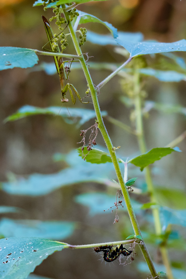 夕方散歩で裏山のカラムシの先の方にカマキリ(オオカマキリのオスかな?)がいた。撮影していると、下からフクラスズメの幼虫が登ってきたので、果たしてどうなることやら!? とカメラを構えて様子を見ていたところ、フクラスズメは葉っぱの方に進み始めた。