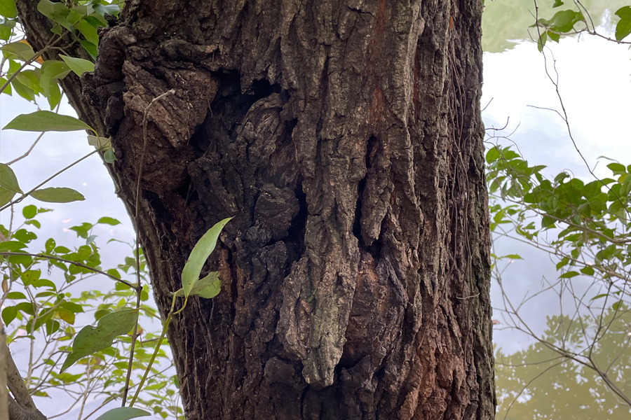 最初に訪れたクヌギ林は、以前から遠目に「あそこにクヌギ林があるなぁ」と気になっていた所だ。藪をかき分け到着してみると、クヌギはざっと5〜60本。なんとその半分は下の左上画像のようなメクレや洞(ウロ)があるではないか! つまり30本近くの木は、時季がくればクワガタがいる可能性が極めて高いということだ。こんな林は初めてだ。
