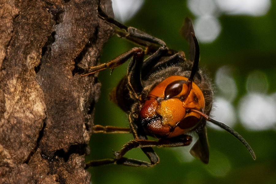 このクヌギ林は樹液が出ている木が多く、小型〜中型のヒラタクワガタが8匹、コクワガタを2匹見つけることができた。オオスズメバチも数匹いたけど、この時季のスズメバチはあまり攻撃的ではないので、写真も落ち着いて撮ることができた。下の右画像はオオクチキムシ。