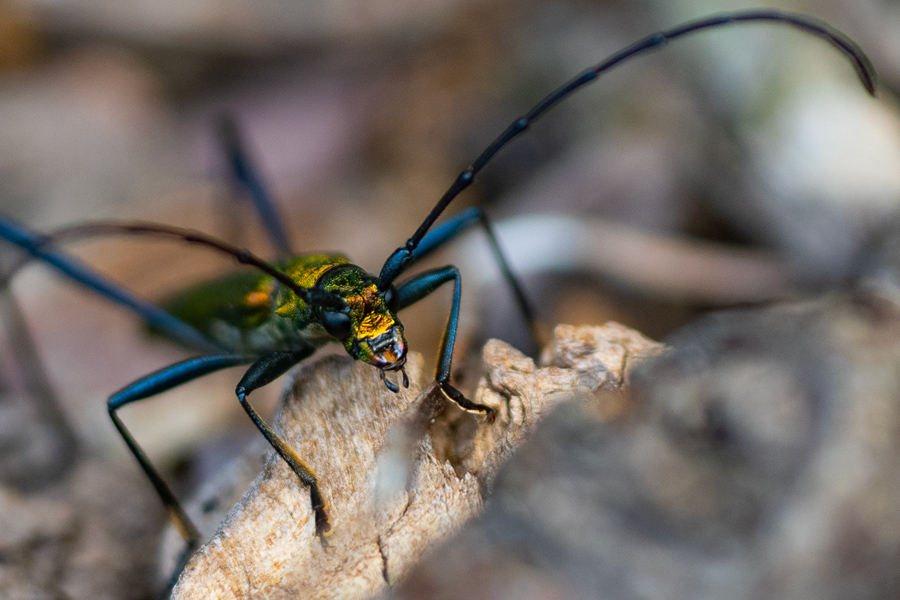 伐採されたアベマキの破片にミドリカミキリがいるのを見つけた。金緑色の美しいカミキリムシだ。
