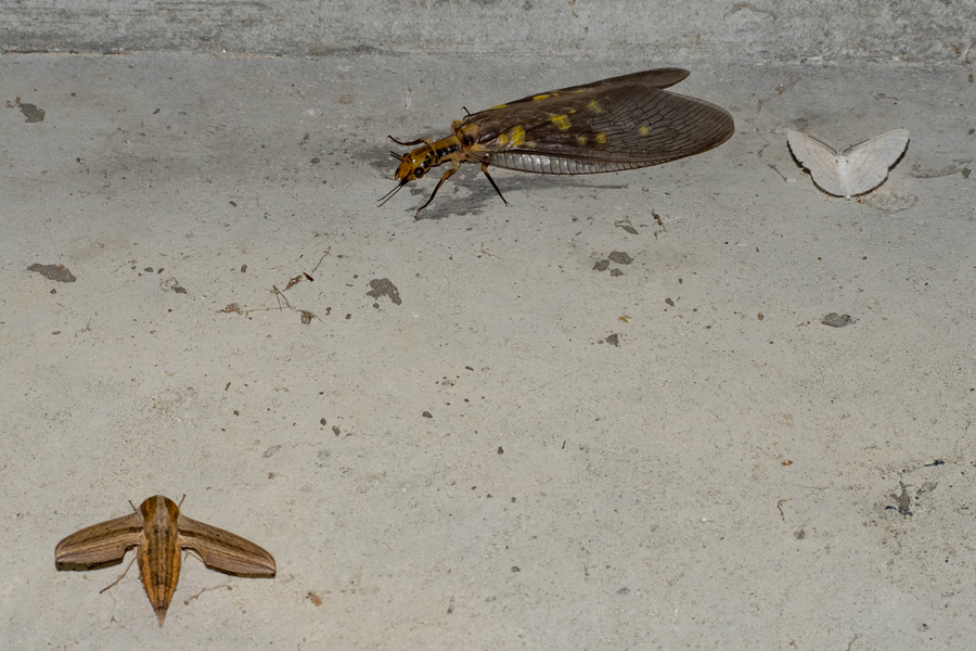 左から、コスズメ、ヘビトンボ、ヒメシャクの一種。コスズメ決して小さな蛾ではないが、巨大なヘビトンボと一緒に写ると小さく見える。ヒメシャクは・・・似たような種が多いので調べるのが面倒くさくて・・・以前は時間をかけて調べていたもんだが・・・これが「老い」というやつかな?