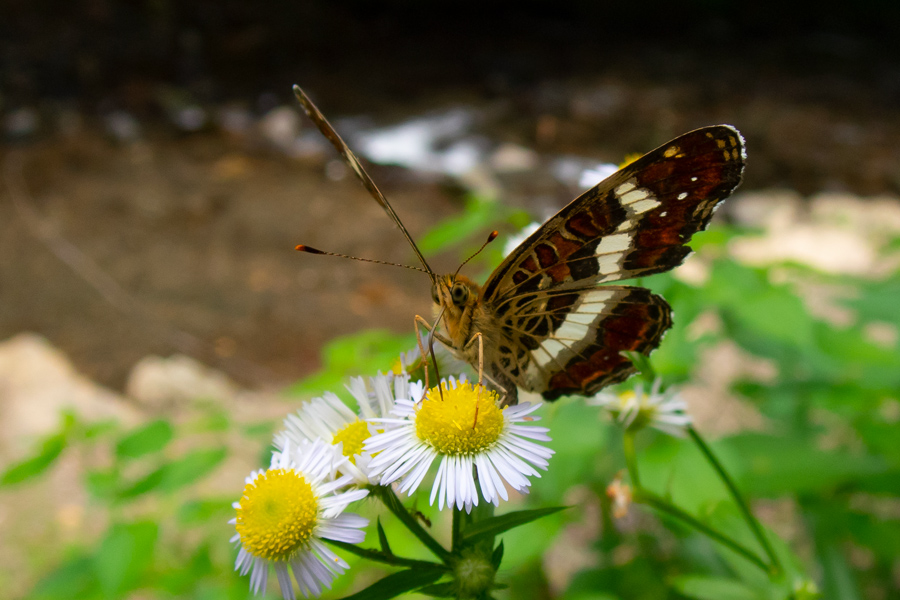 川沿いのヒメジョオンの花で吸蜜しているサカハチチョウを見つけたので、背景に貴船川を入れて撮ってみた。