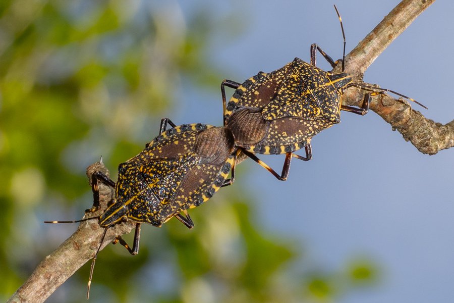 自宅の桜の枝では交尾中のキマダラカメムシを見つけた。
