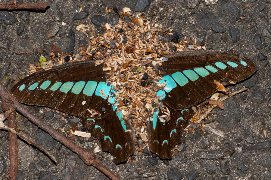 交通量の少ない裏山への道路は、1日に10台前後しか車は通らない 。だから虫の死骸なんかも踏み潰されずに残っていることが多い。今朝は道路の真ん中にアオスジアゲハの死骸があった。